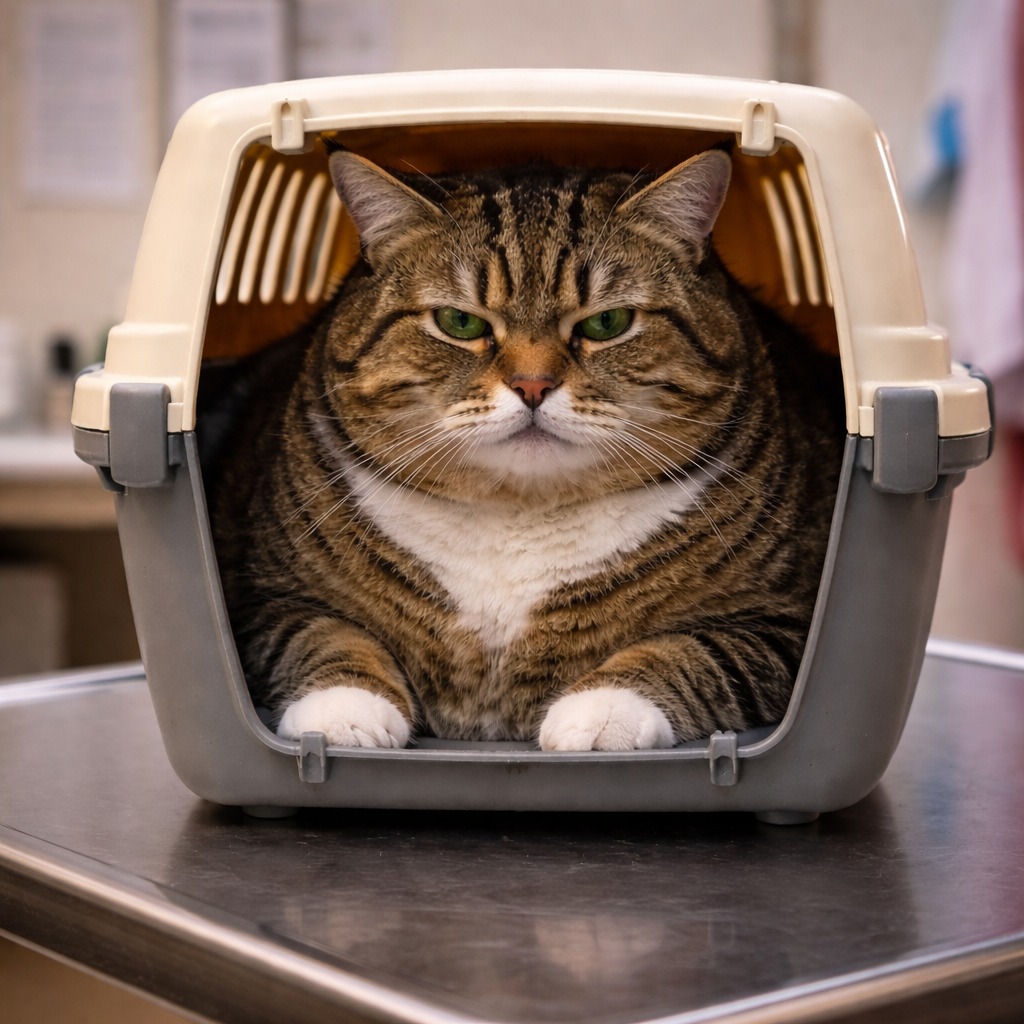 Кота привезли «на похудение» в такой солидной переноске, что складывалось впечатление: внутри не питомец, а какой-нибудь важный начальник на инспекции. Конструкция была надёжная, просторная, с окошком, из которого на окружающий мир смотрело круглое, слегка обиженное лицо с усами. По выражению морды сразу было ясно — этот кот уже многое понял о людях, но пока аккуратно собирает факты.