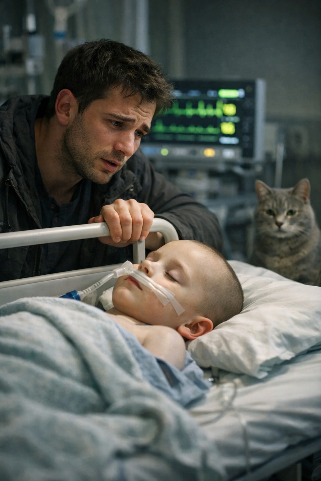 Кошка внезапно встала и легла на голову мальчика. В этот момент в палату снова вошел врач. Он хотел еще раз проверить показатели перед тем, как окончательно принять решение. Но, увидев эту сцену, он остановился.