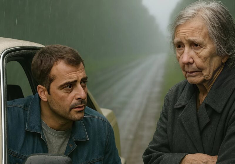 И вдруг у обочины я заметил странное: пожилая женщина стояла, промокшая до нитки, её пальто было тяжёлым от воды, а руки дрожали от холода. Весь её вид говорил, что помощь нужна срочно.